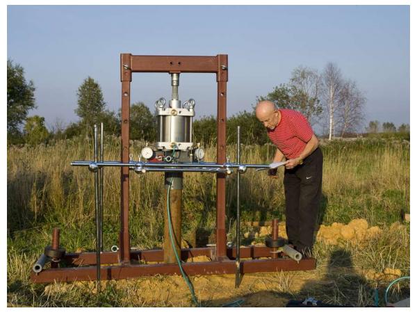 В качестве анкерной системы могут использоваться анкерные комплекты А1, А2 и А3, обеспечивающие восприятия реактивных усилий до 60 кН. Для проведения испытаний винтовой штамп со стволом (труба диам. 127), при помощи буровой установки, завинчивают с забоя скважины на отметку испытания. Для сопряжения с трубой 146 следует применять переводник 127\146. Стол штампа должен находится в пределах 0,4-0,6м от поверхности земли. Реперная система со стойками, подвижными ригелями и столом устанавливают  вокруг ствола штампа. На ствол штампа устанавливают нагрузочный стол с пневмоцилиндром и закрепляют индикаторы ИЧ-50. К пневмоцилиндру, с помощью быстроразъемного соединения, подключают манометрическую головку. К манометрической головке подключают ресивер. Шток пневмоцилиндра, через шаровой шарнир, упирают в анкерную систему. Стол реперной системы позиционируют относительно пневмоцилиндра, для опирания на него штоков индикаторов ИЧ-50.  В ресивер с помощью автомобильного насоса (или другим способом), закачивают воздух до давлеия 0,6-1 мПа. Фиксируют “ нулевые  показания ” индикаторов  ИЧ-50. При помощи редуктора манометрической головки, задают давление в пневмоцилиндре, соответствующей первой ступени нагрузки. Величина давления контролируется по образцовому манометру, на манометрической головке. При выдержке на ступени, давление с помощью редукционного клапана, поддерживается на заданном уровне. В процессе проведения опыта, давления в ресивере будет уменьшаться, но на любой стадии испытаний, давления можно увеличить путем подкачки воздуха в ресивер. В процессе испытаний, фиксируется давление в нагрузочной системе, время и показания индикаторов как рекомендовано в ГОСТ. После завершения опыта, можно выполнить ступенчатую разгрузку, путем выпуска воздуха из пневмоцилиндра, посредством редуктора. В период эксплуатации винтового штампа, требуется лишь проведение контрольных испытаний, для проверки герметичности нагрузочной системы, и устранения, при необходимости, утечек воздуха.
